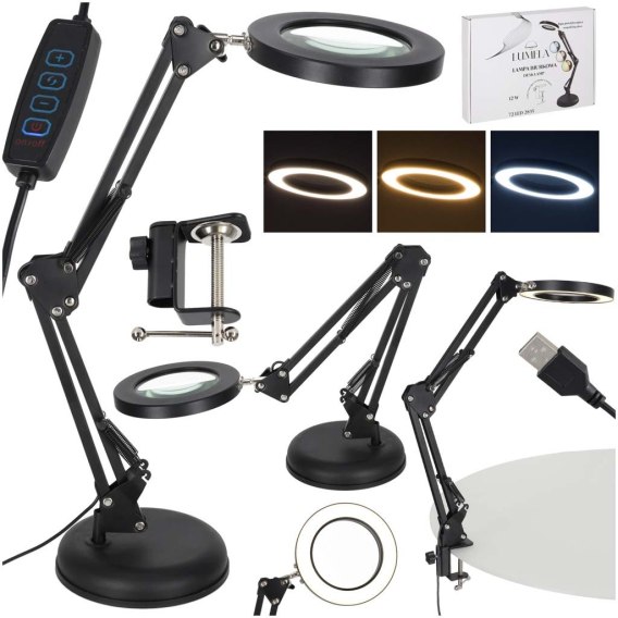 Lampka na biurko biurkowa LED z lupą szkło powiększające obrotowy wysięgnik 2 sposoby mocowania