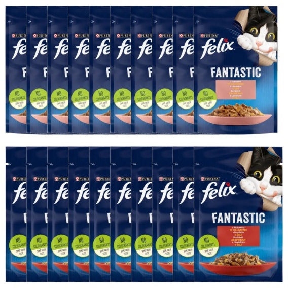 • ZESTAW 10 + 10 FELIX Fantastic Mokra karma dla kotów w galaretce 85 g wołowina + łosoś